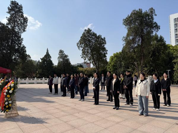 巍峨矗立的烈士纪念塔前,全体人员整齐列队、静默肃立。默哀结束,师生代表向烈士敬献花篮,张敏上前整理缎带,全体人员瞻仰纪念塔,向革命先烈致以深切的悼念和崇高的敬意。